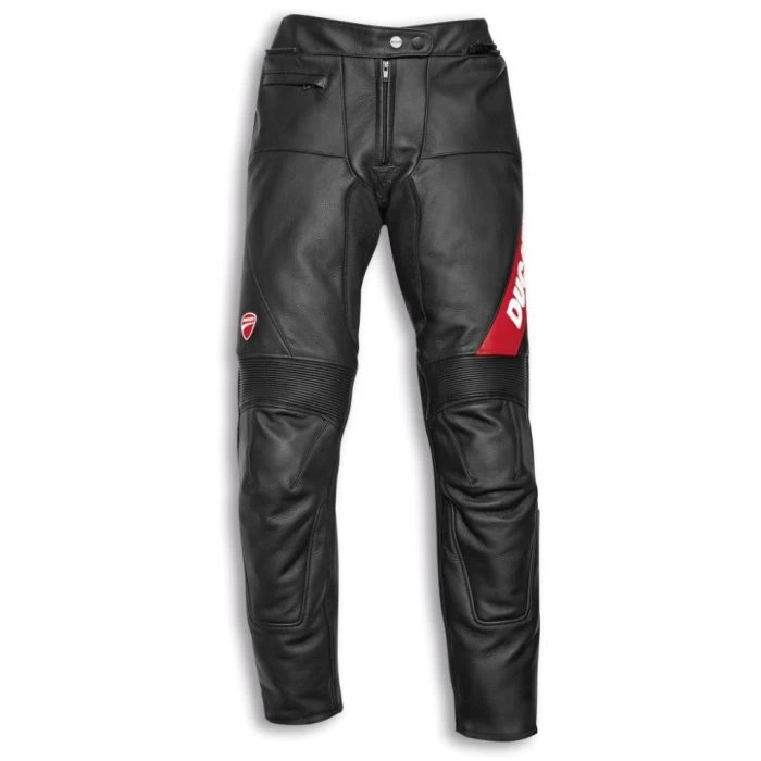 Enjoy the thrill of every bend with the Company C4 leather trousers manufactured exclusively by Dainese for Ducati and specially designed for sporty road use. Made from soft, durable cowhides, they guarantee excellent freedom of movement. The safety of the garment is CE certified and features shin and knee protectors and soft reinforcements in the hip area. The Nanofeel® lining and stretch knee inserts maximize comfort, while the practical zip can be used to pair the trousers with all the jackets in the collection, making them extremely versatile. Available in two versions, for him and for her, to guarantee an exceptional fit for everyone who jumps onboard the bike. The sleek look of this garment is enhanced by red inserts with a contrasting color Ducati logo for a classic yet iconic style: the perfect choice to enjoy all the thrill of a sporty ride, in perfect Ducati style.